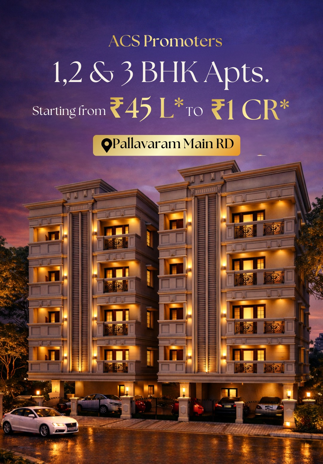 Flats in ACS Promoters start from ₹45 Lakhs* onwards. The price depends on the BHK type (1 BHK 2 BHK or 3 BHK), floor, and facing. Contact us on 70666 70666 for the latest price list and available units.